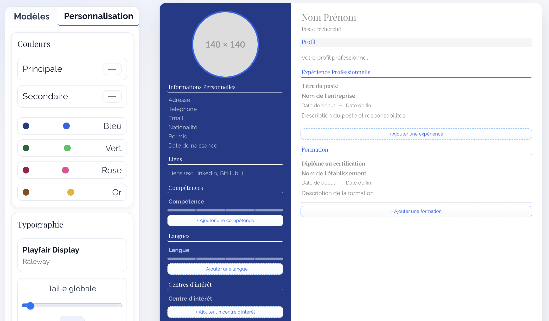 Découvrez la simplicité de notre éditeur pour construire la base de votre CV.